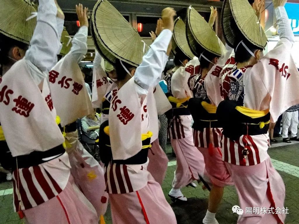 高知县的“YOSAKOI祭 (よさこい祭り)”,穿着亮丽衣赏的舞者为了赶走田里的鸟雀,会敲打农器具和让鸣子作响,是一个非常热闹的祭典活动。